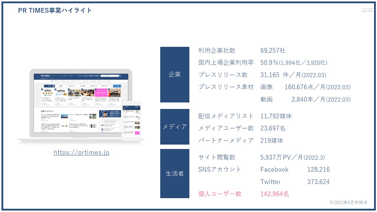 「PR TIMES」利用企業数は2022年5月末時点で6万9257社となり、前年同期比で1万4831社の増加、前四半期比で3597社の増加になっています。また5月末時点で、国内上場企業のうち50.9%にご利用いただいております。