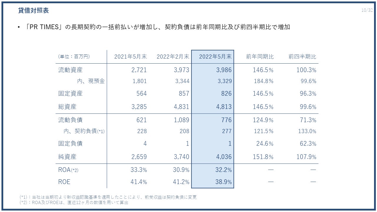 「PR TIMES」利用顧客による長期契約の一括前払いが増加し、契約負債(*1) は前年同期比及び前四半期比で増加、過去最高を更新しています。「PR TIMES」長期契約の一括支払いただいた金額が契約負債にあたり、当社の信用力が高まっていることの表れだと前向きに評価しています。