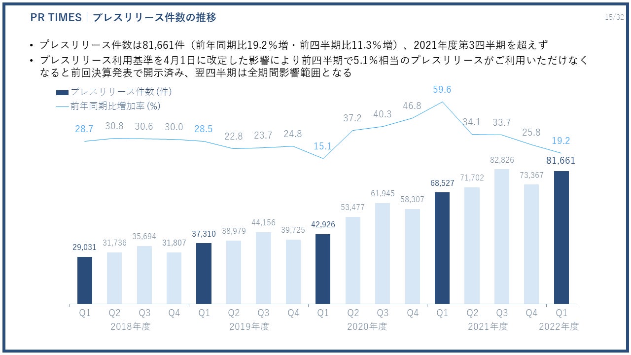 2022年度第1四半期は、8万1661件のプレスリリースを配信いただき、前年同期比で19.2%増、前四半期比で11.3%増となりました。4月1日にプレスリリース利用基準を改定した影響によって、前四半期で5.1%相当のプレスリリースがご利用いただけなくなると前回決算発表で開示しています。第1四半期は1か月間が対象となりましたが、翌四半期は全期間影響範囲となります。
