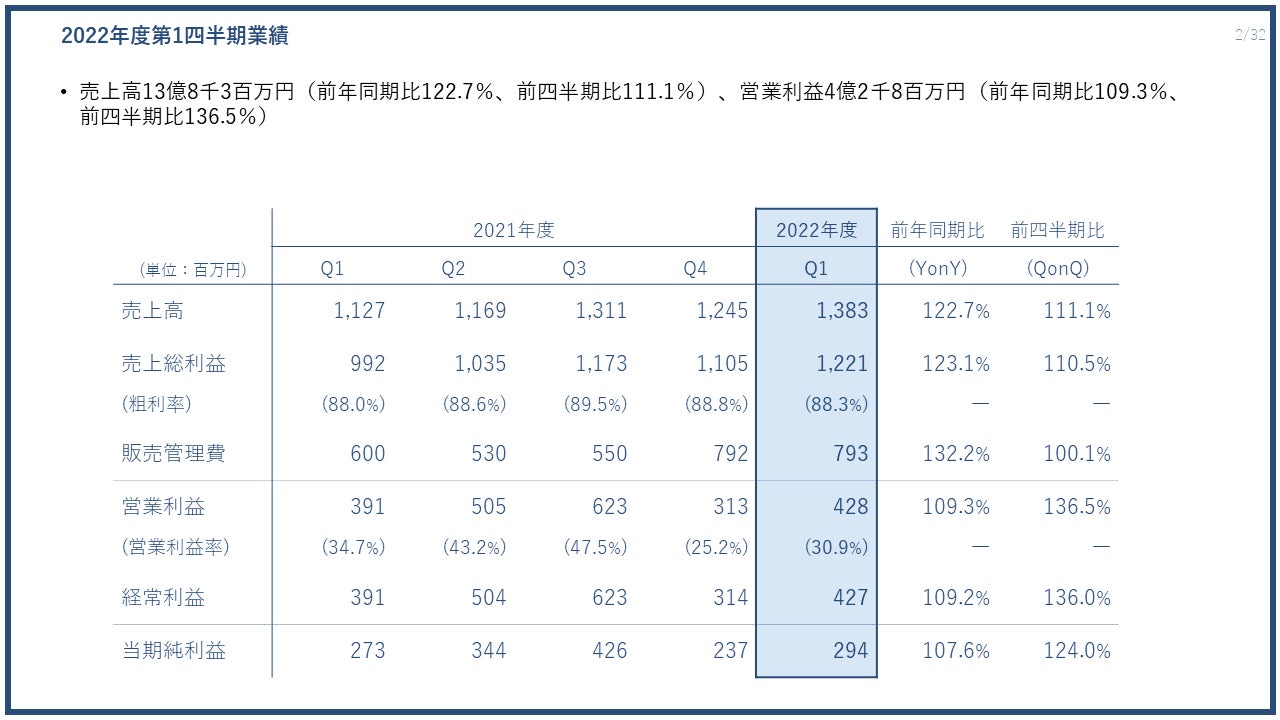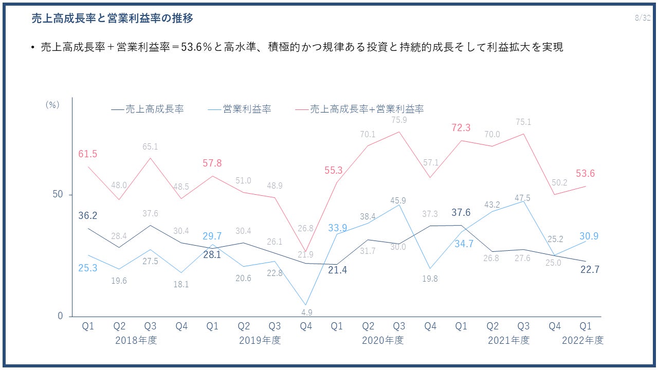 今期2022年度は投資期であるものの、売上高成長率と営業利益率の合計は53.6%と、第1四半期としては高水準をキープしています。