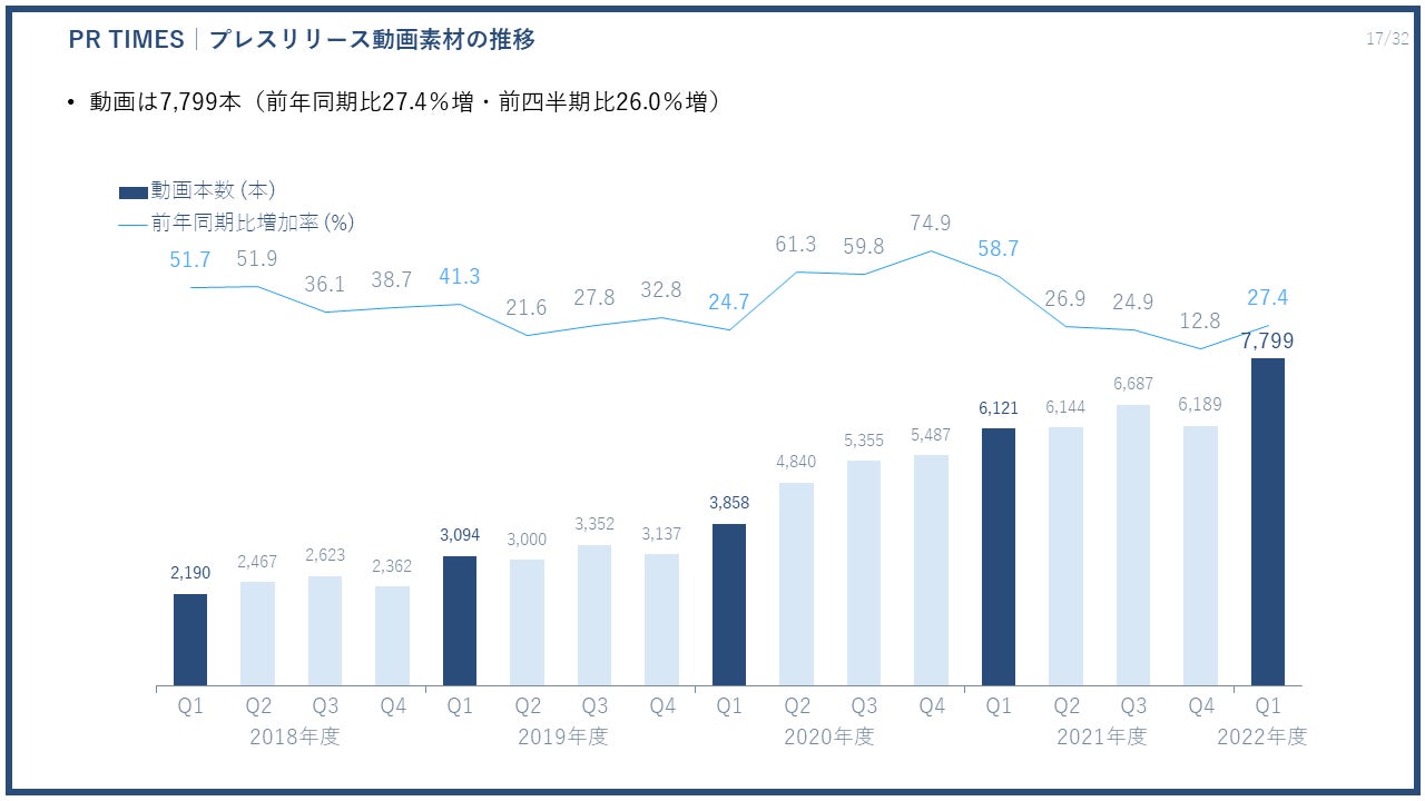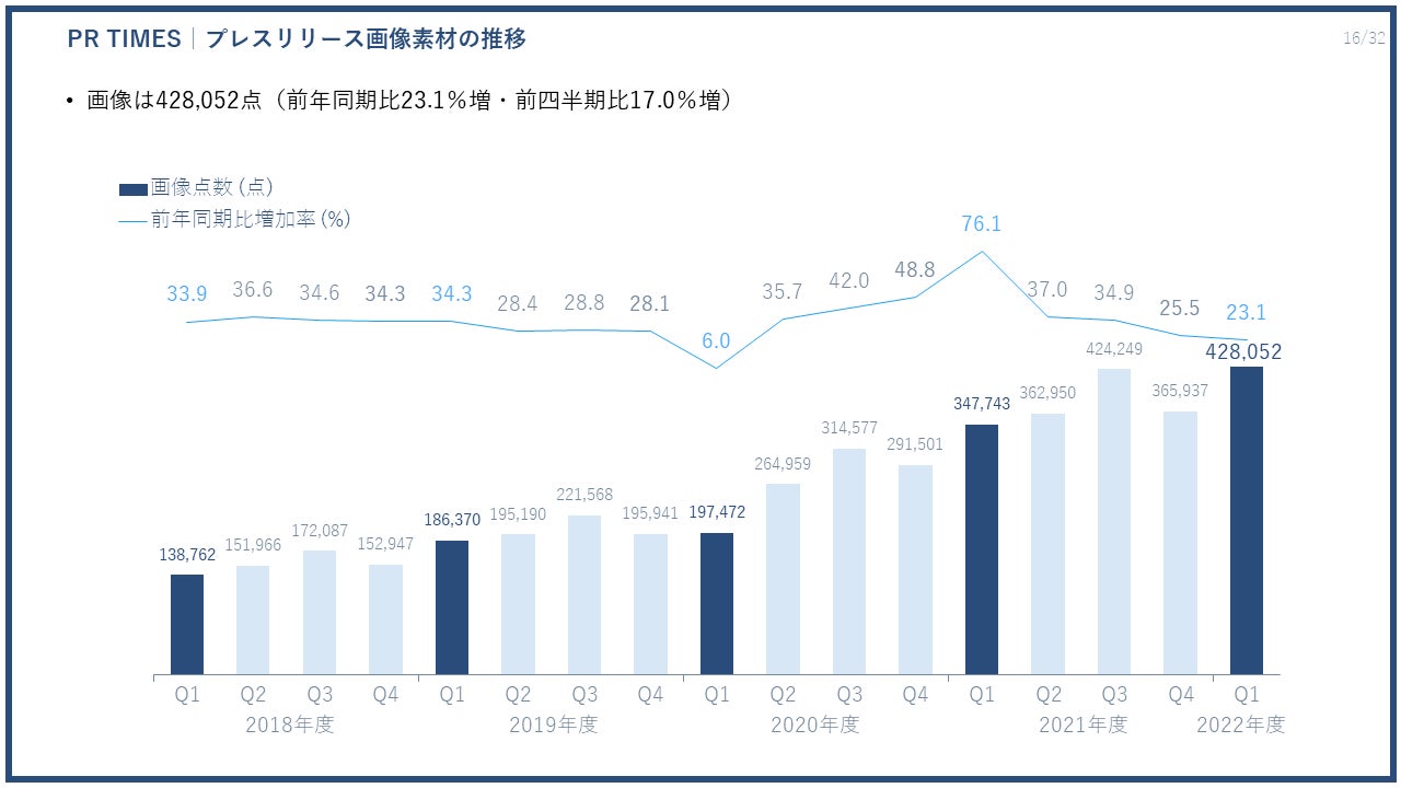 「PR TIMES」のプレスリリースに掲載いただく画像や動画の数については、画像が42万8052点(前年同期比23.1%増・前四半期比17.0%増)、動画が7799本(前年同期比27.4%増・前四半期比26.0%増)といずれも過去最高を更新しました。プレスリリースのリッチコンテンツ化が進んでいます。