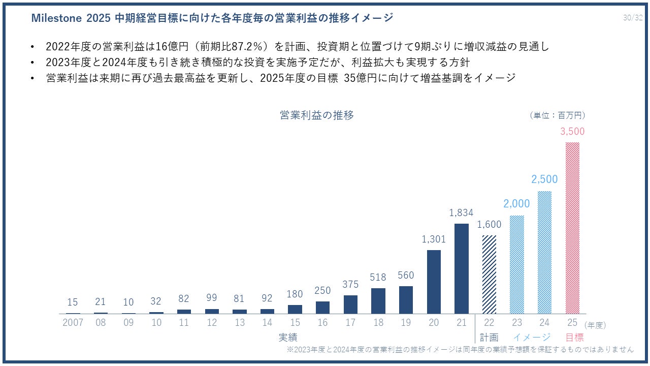 2022年度の営業利益は16億円(前期比87.2%)を計画しており、投資期と位置づけて9期ぶりに増収減益の見通しとなっております。2023年度と2024年度も引き続き積極的な投資を実施予定であるものの、利益拡大も実現する方針で、来期には再び過去最高益を更新し、2025年度の目標35億円に向けて増益基調をイメージしています。
