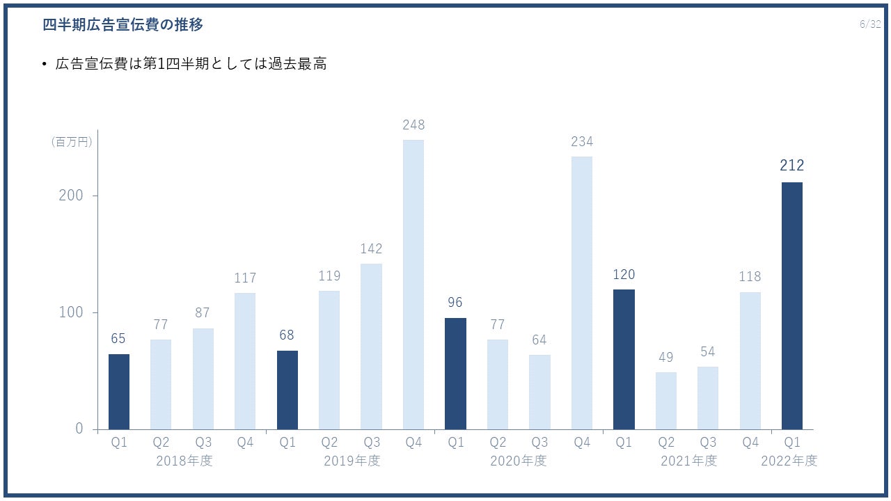S&Mの中で、広告宣伝費は想定より若干上回る投資を行って、第1四半期としては過去最高を更新しています。四半期広告費は2億1200万円、前年同期比76.2%増となりました。