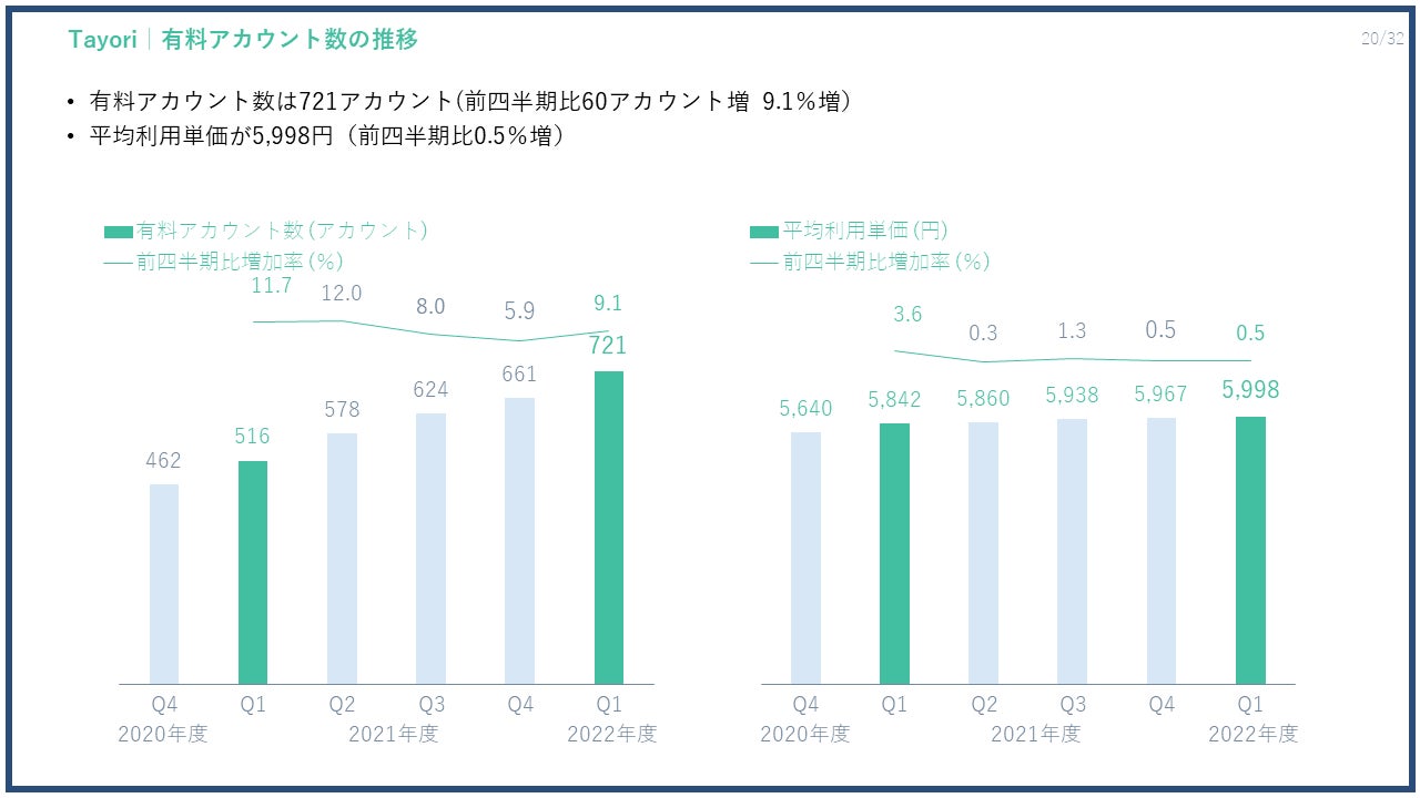 5月末時点の有料アカウント数は721と、前四半期比で60アカウント増となり、「Tayori」も順調に有料化が進んでいます。平均利用単価は5998円(前四半期比0.5%増)と順調に利用単価が増加しています。