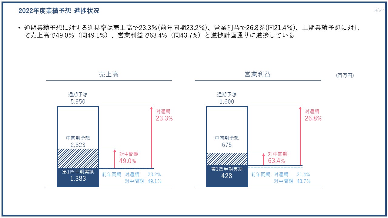 2022年度の通期業績予想に対する進捗率は売上高で23.3%(前年同期23.2%)、営業利益で26.8%(前年同期21.4%)、上期業績予想に対して売上高で49.0%(前年同期49.1%)、営業利益で63.4%(前年同期43.7%)と計画通りに進捗しております。