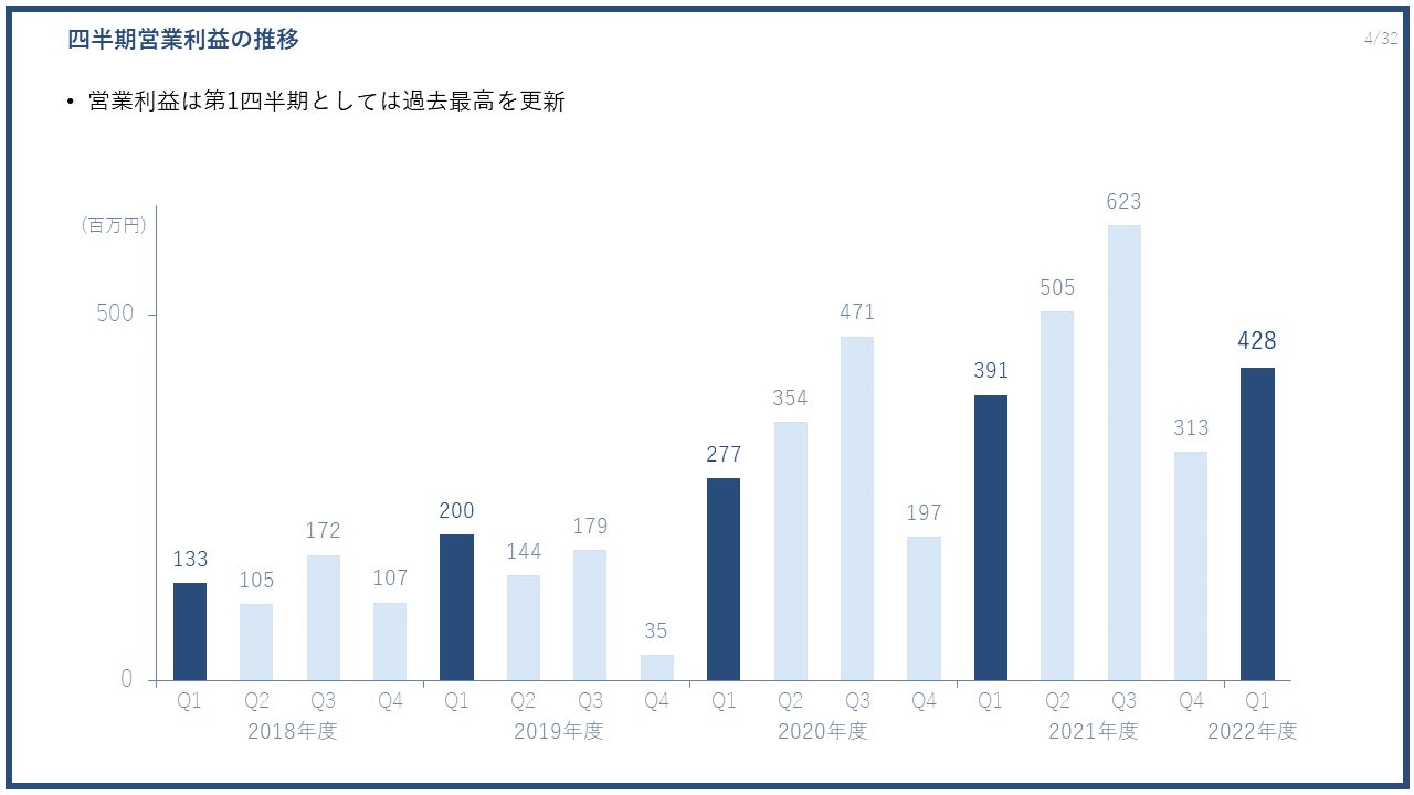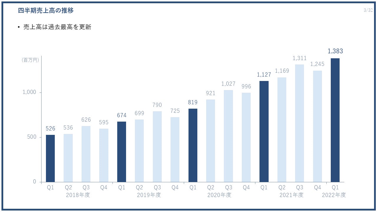 四半期売上高の推移においては、堅調に成長基調を継続しており、第1四半期は過去最高の四半期売上高を更新しております。