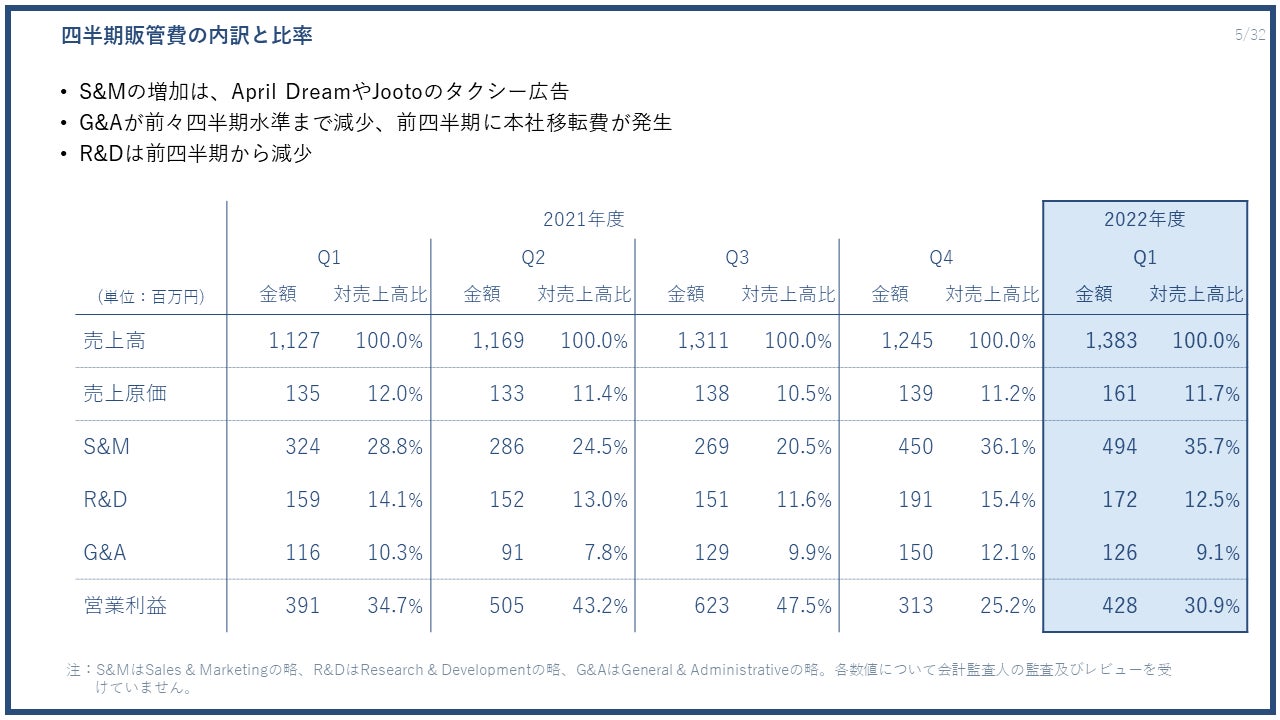 第1四半期のS&Mは、April Dreamや「Jooto」のタクシー広告により増加しています。G&Aは、前四半期が本社移転費用により増加したことに対し、前々四半期水準まで減少しています。R&Dは前四半期から減少しているものの一定水準をキープしています。