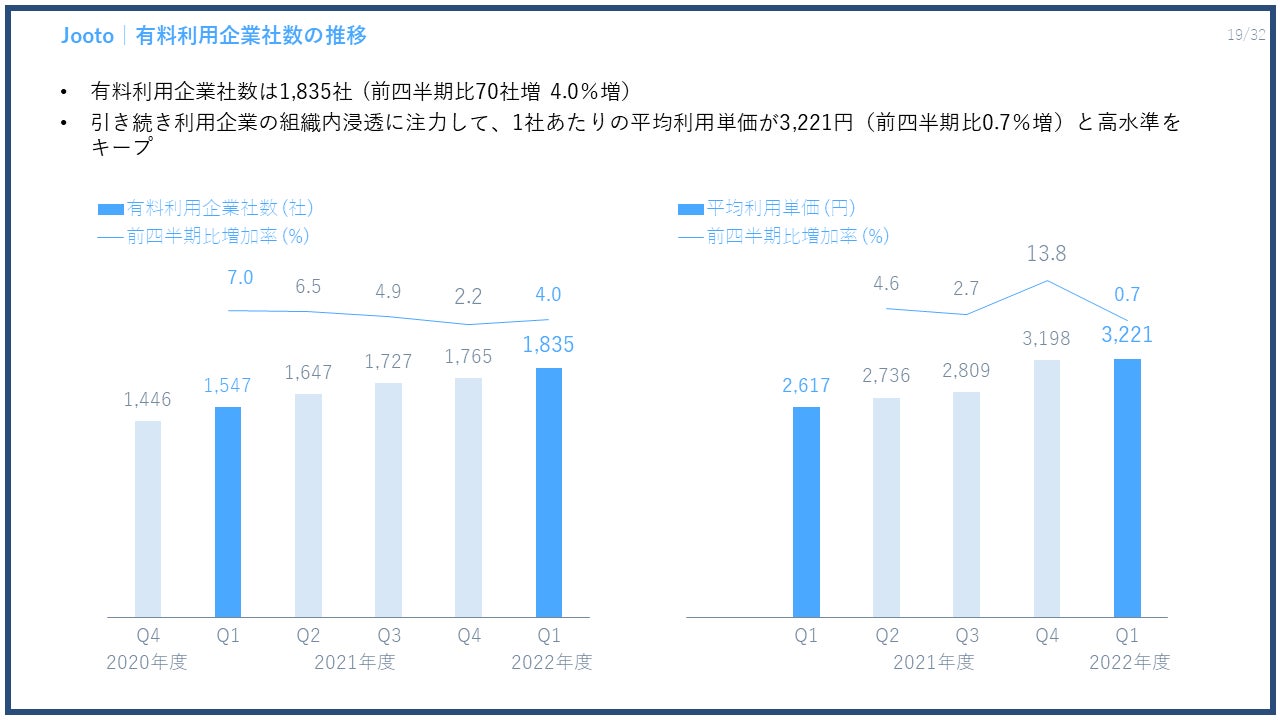 5月末時点の有料利用企業社数は1835社で、前四半期比で70社増と順調に有料化が進んでいます。引き続き、利用企業の組織内浸透に注力しており、1社あたりの平均利用単価が3221円(前四半期比0.7%増)と高水準をキープしています。今後は利用者数と利用単価の両方を追っていく方針です。