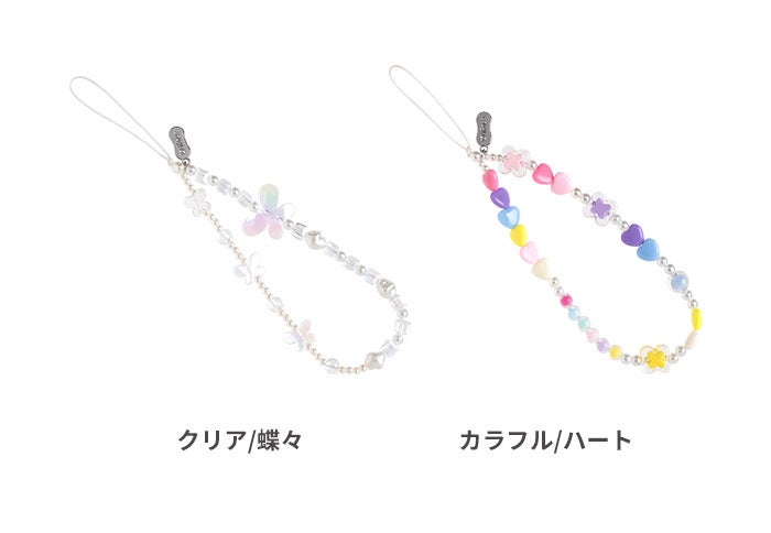 「可愛らしさ」をテーマに2種類のビーズストラップができました。クリアのパーツの中に、シルバーとパールが入った可愛らしさと上品さのある「クリア/蝶々」(下記写真左)とカラフルな小ぶりのハートとパールが散りばめられた甘過ぎないキュートな「カラフル/ハート」(下記写真右)。どちらもお菓子のようなカラーのビーズをアシンメトリーにあしらったストラップ。スマホケースも華やかにアレンジしたい方にとってピッタリなアイテムです。