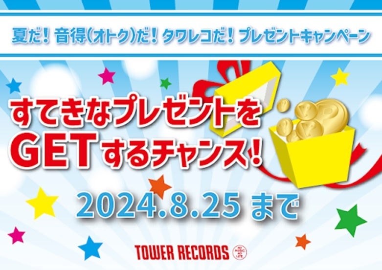 タワーレコード株式会社では、7月19日(金)~8月25日(日)、一か月以上の長期に渡り『夏だ!音得(オトク)だ!タワレコだ!プレゼントキャンペーン』として、当社Eコマースサイトのタワーレコ―ド オンライン(https://tower.jp/)を中心に5つのプレゼントキャンペーンを開催し、人気アーティストたちの新作リリースや夏フェス出演など、これまで以上の盛り上がりを見せる2024年の夏の音楽シーンを盛り上げていきます。