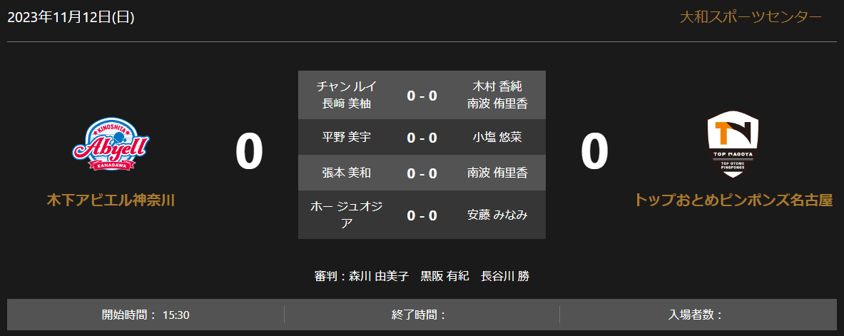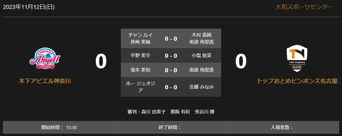 ノジマTリーグ 2023-2024シーズン 公式戦 11月12日開催 木下アビエル神奈川 vs トップおとめピンポンズ名古屋オーダー発表