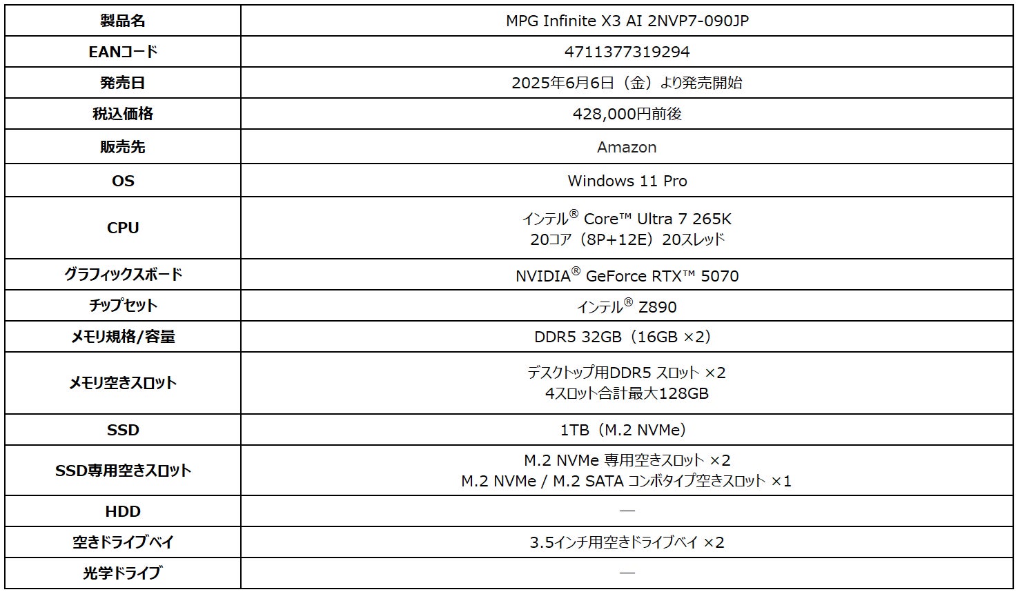 この度、エムエスアイコンピュータージャパン株式会社は2025年6月6日(木)より新たな製品を販売開始します。高性能かつ冷却性能に優れ、AIなどの最新機能を活用できるゲーミングデスクトップPCブランド『MPG Infinite X3 AI』シリーズから、最新のインテル® Core™ Ultra 7 265K、NVIDIA® GeForce RTX™ 5070を搭載し、内部を眺められるガラスパネル、おしゃれなRGBラインが煌めくブラックカラーのシックな筐体が特徴的なゲーミングPC「MPG Infinite X3 AI 2NVP7-090JP」を新たにラインナップに追加いたします。