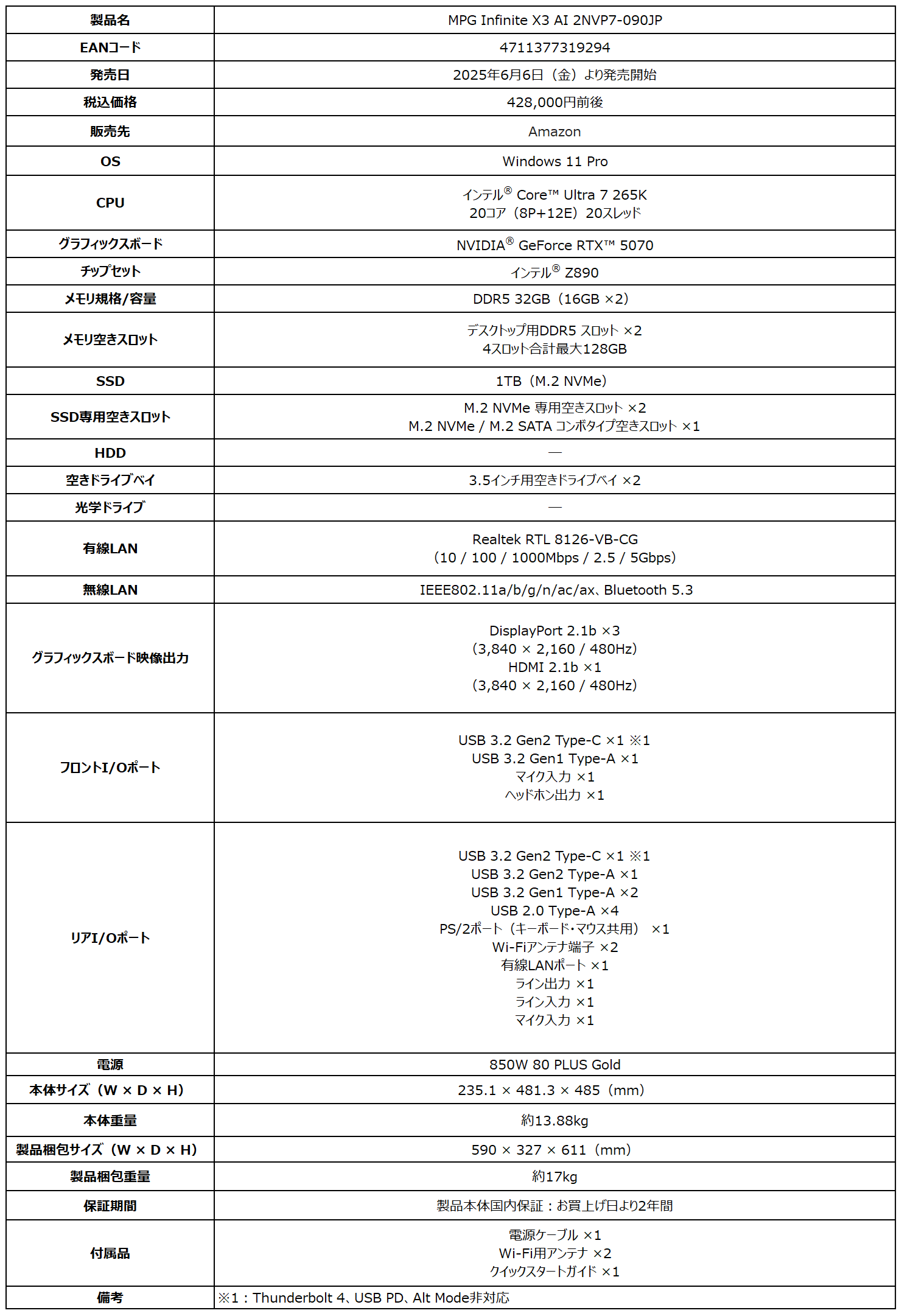 【MPG Infinite X3 AI 2NVP7-090JP】