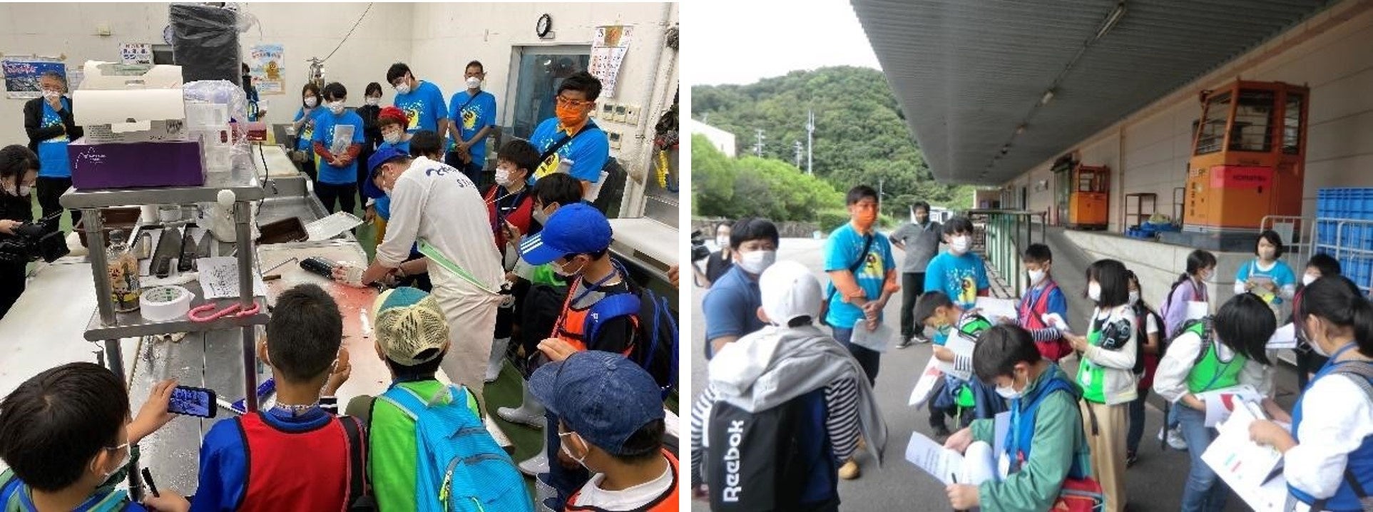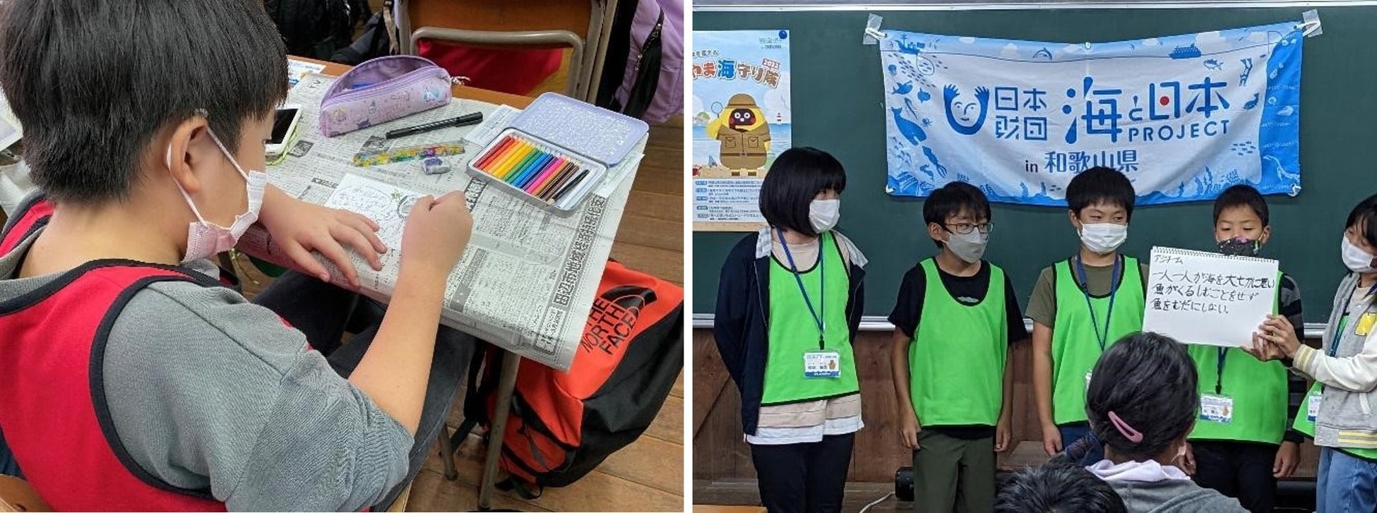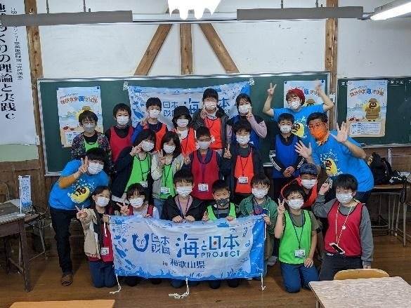 海と日本プロジェクトin和歌山県実行委員会(テレビ和歌山内)は、次世代を担う子どもたちに「和歌山の海」の美しさを再発見してもらい、海を守ることの大切さを再認識してもらえるように、10月8日(土)~10月9日(日)の2日間、和歌山県田辺市・白浜町で体験型学習イベント「紀南が未来を変える~わかやま海守り隊2022~」を開催しました。参加者は和歌山県内の小学校5、6年生19名で、「海守り隊」として、和歌山県が抱える持続的な水産資源確保の問題について、近畿大学水産研究所で「和歌山県の水産業の現状や水産資源を守る一つの方法である養殖業の歴史や役割」を学び、とれとれ市場で「養殖魚のマダイが加工される工程」などを学んだ後、京都大学白浜水族館や天神崎で実際に自分たちの目で見て触れて、和歌山県田辺市・白浜町近海の生き物の観察を行いました。そして、このイベントを通して、感じたことや学んだことを各自、1枚のポストカードに仕上げました。