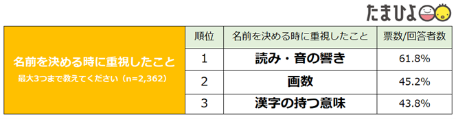 上位3位は昨年と変わらない結果となりました。名前の響きや呼びやすさなど、「読み・音の響き」が名づけで最も重視する項目であることがわかりました。