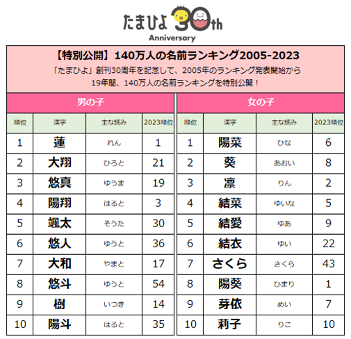 「たまひよ」創刊30周年を記念し、2005年のランキング発表開始から19年間、約140万人の名前ランキングを特別公開