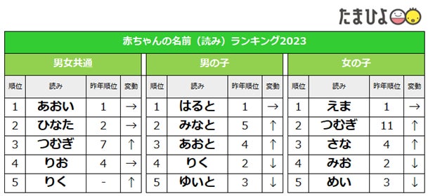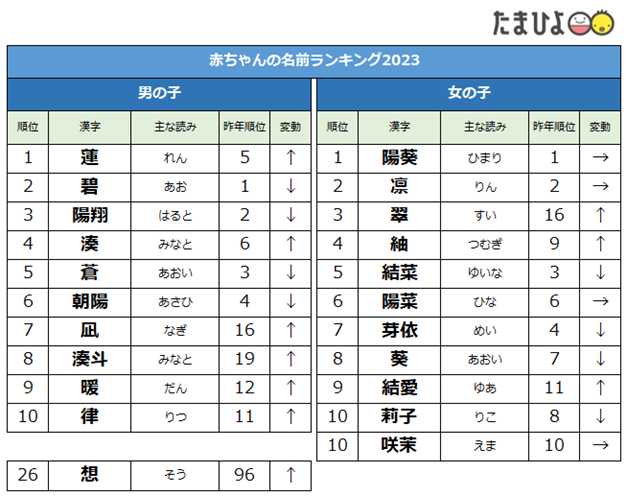 [国内最多28万人調査]たまひよ 赤ちゃんの名前ランキング2023 男の子「蓮」1位復活、女の子「陽葵」8年連続1位!