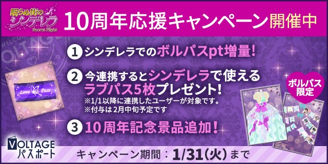 「眠らぬ街のシンデレラ Secret Night」(以下、「シンデレラSN」)は、ジャーナリストを目指しているヒロインがひょんなことからイケメンセレブたちと出会い、とびきりゴージャスでちょっぴり危険な恋が楽しめるボル恋タイトルです。2013年1月に配信を開始して以来、煌びやかな世界感や重厚なストーリー、そして魅力的なキャラクターたちが多くの方に支持され、今年で10周年を迎えることができました。支えてくださったファンの皆様へ感謝を込めて、アプリでは10周年記念の特別企画をご用意しました。この機会しか手に入らない限定アバターもございますので、ぜひこの機会に「シンデレラSN」 10周年をお楽しみください。