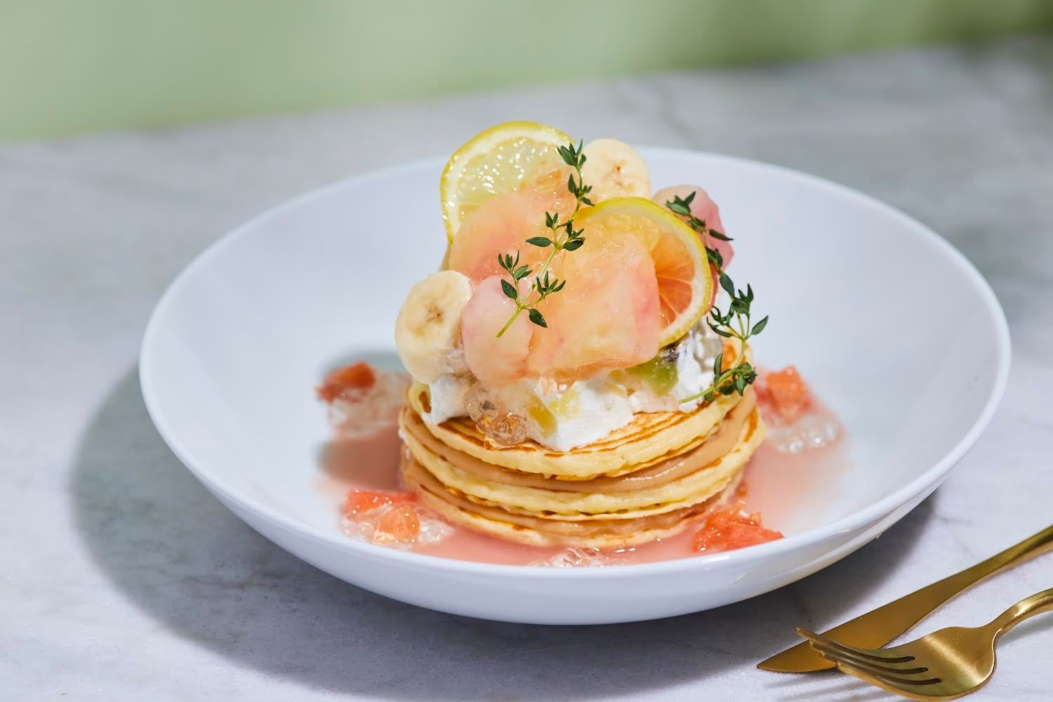 とろっとジューシーな白桃に、お店で手仕込みするクリームチーズベースのフルーツアイスやピンクグレープフルーツやバナナ、レモンなど旬のフルーツをトッピング。パンケーキにはオリジナルJ.S.ブレンドティーのカスタードクリームをサンドし甘さを控えた味わいに。