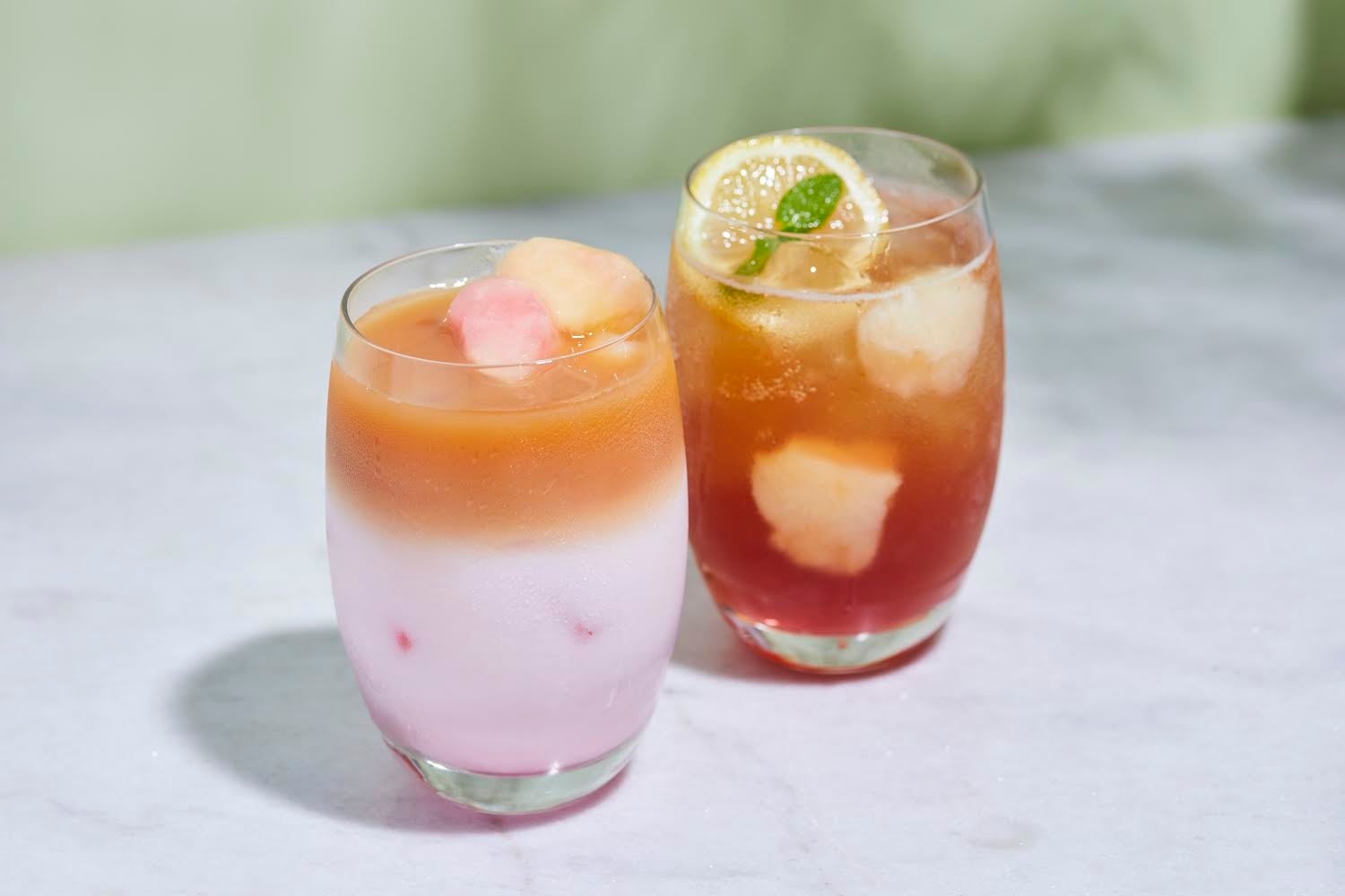 ピーチフレーバーをベースに、オリジナルのブレンドティーとごろっと白桃を合わせた「桃のミルクティー」、オリジナルのブレンドティーをソーダで割り、ごろっと白桃を合わせた桃感たっぷりの「桃のティーソーダ」と気分に合わせてお選びいただけます。
