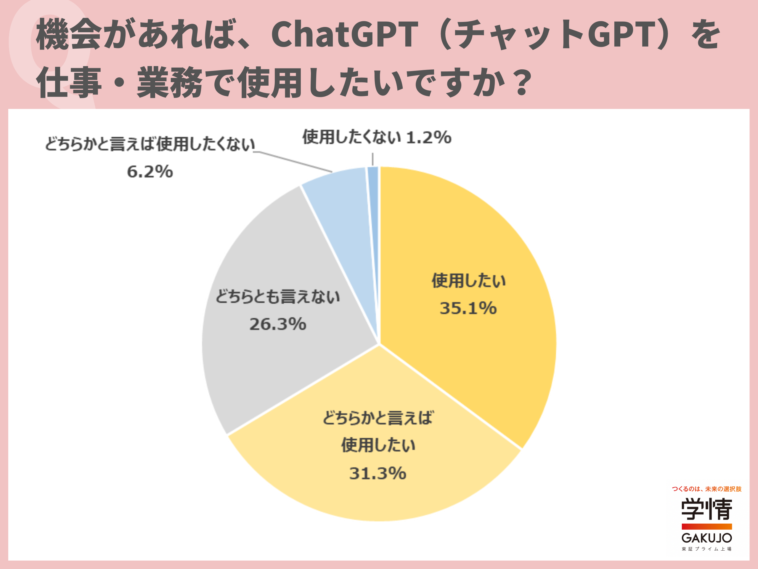 ChatGPTの仕事での利用について、「使用したい」と回答した20代が35.1%に上りました。「どちらかと言えば使用したい」31.3%を合わせると、仕事で「ChatGPT」を活用したいとした20代が7割に迫ります。「既に利用していて、生産性アップを実感している」「文章作成などに活用したい」「検索ワードが明確でないときに使用したい」「定型的な業務はAIに任せる」「考えたり、議論したり重要なことに時間を割きたい」といった声が上がりました。