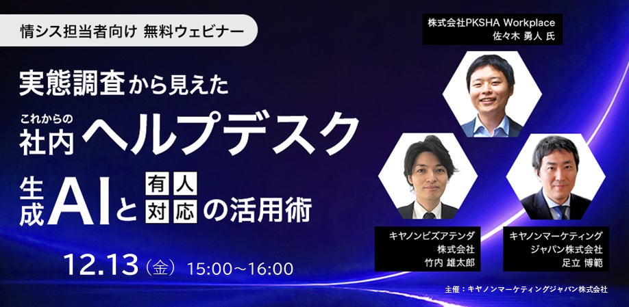 キヤノンマーケティングジャパン株式会社(本社:東京都港区、代表取締役社長:足立正親、以下キヤノンMJ)は、生成AIの活用や有人対応のあり方など、社内ヘルプデスクを進化させる方法について解説する無料ウェビナー「実態調査から見えたこれからの社内ヘルプデスク~生成AIと有人対応の活用術~」を2024年12月13日(金)に開催します。