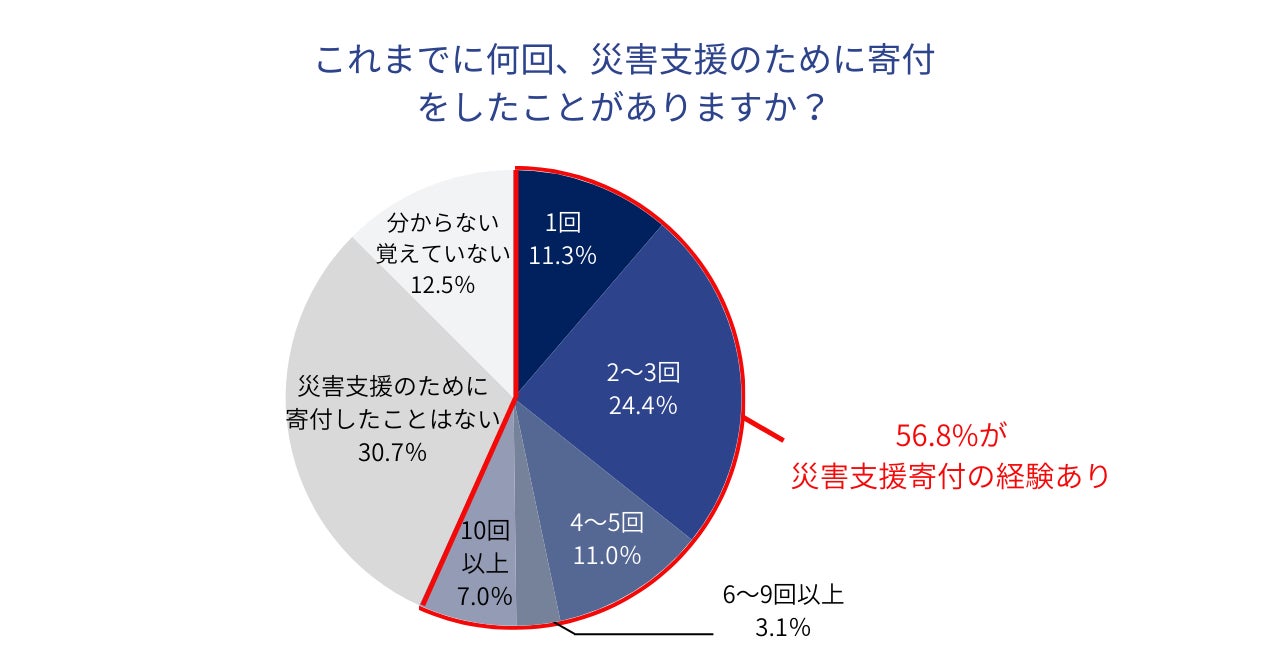 災害支援のために金銭の寄付をしたことがある人の割合は56.8%。寄付経験の回数は最も多いのが「2~3回」で、東日本大震災が起きた2011年、熊本地震が起きた2016年、能登半島地震が起きた今年(2024年)に寄付した経験がある人が多かった。1回当たりの寄付額は「1,000円以下」が最多の44.2%。次いで「1,001円~3,000円」が29.7%。