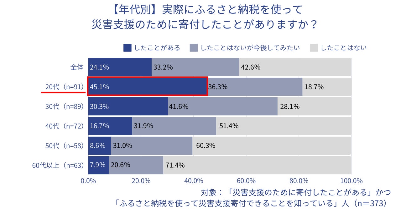 ・ふるさと納税を使った災害支援寄付の活用経験は、20代が最も高い割合となった。