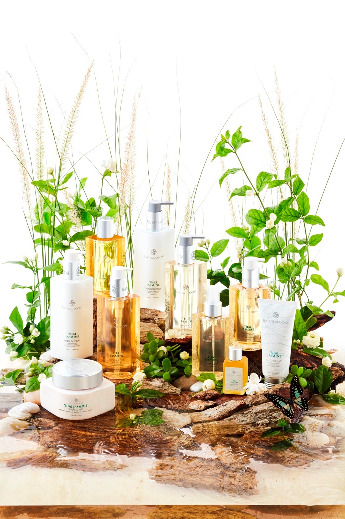 ジャスミンやレモングラスなどオリエンタルな香りと本格的なボディーケア製品、ヘアケア製品、