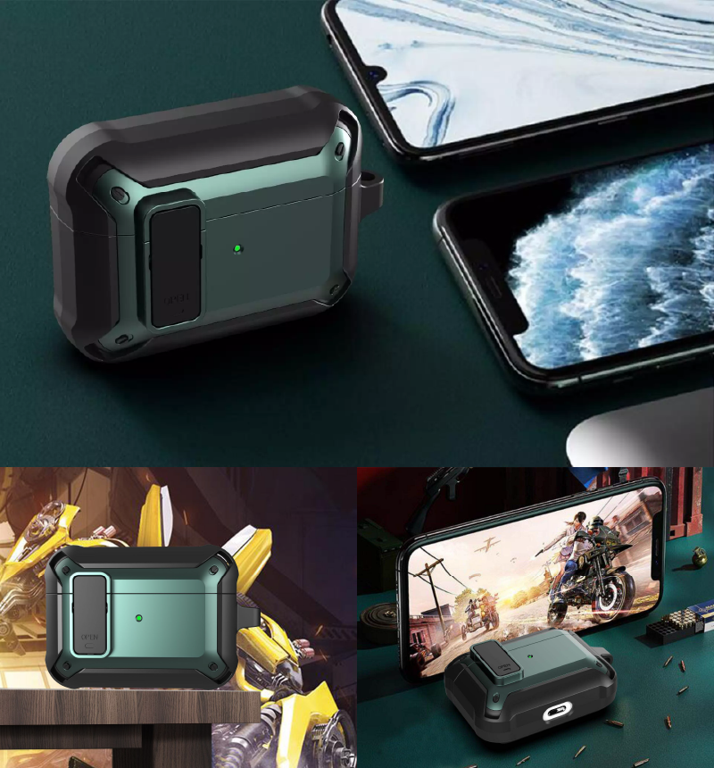また、セキュリティーロックが可能なボタンによる開閉式のため、AirPodsが簡単にケースから外れることはありません。