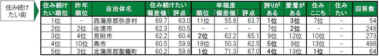 西蒲原郡弥彦村が、初登場で1位に輝きました(昨年は累計回答者数が50名未満でランキングの集計対象外)。2位は3年連続で佐渡市、3位は見附市です。4位は燕市で、昨年10位から順位を上げました。その他、昨年から順位を上げてトップ10入りしたのは、9位新潟市東区(昨年11位)、10位南蒲原郡田上町(昨年13位)です。