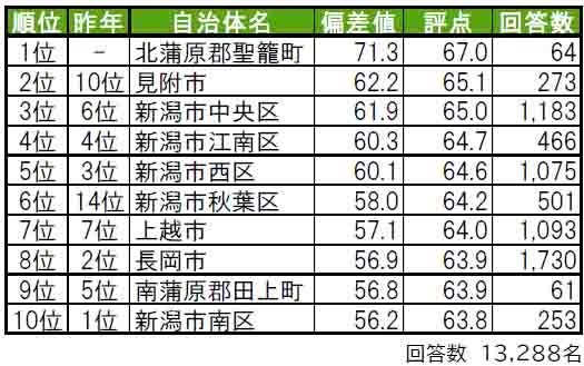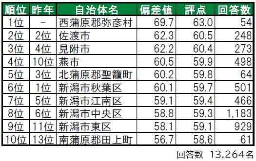 北蒲原郡聖籠町が、唯一偏差値70台の高い評価を得て1位に輝きました(昨年は偏差値50未満だったため順位非公表)。2位は見附市(昨年10位)、3位は新潟市中央区(昨年6位)で、それぞれ昨年から順位を上げてトップ3入りしています。その他、順位を上げてトップ10入りしたのは、6位新潟市秋葉区(昨年14位)です。