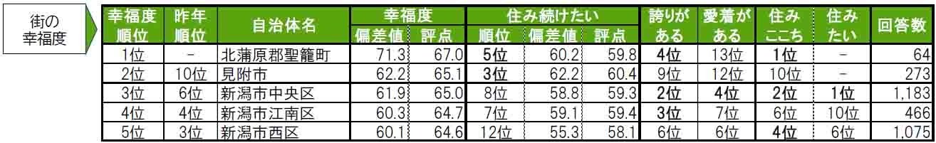 街の幸福度1位は昨年ランク外だった北蒲原郡聖籠町。2位見附市、3位新潟市中央区。