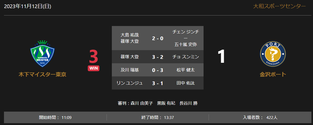 ノジマTリーグ 2023-2024シーズン 公式戦 11月12日開催 木下マイスター東京vs金沢ポート試合結果