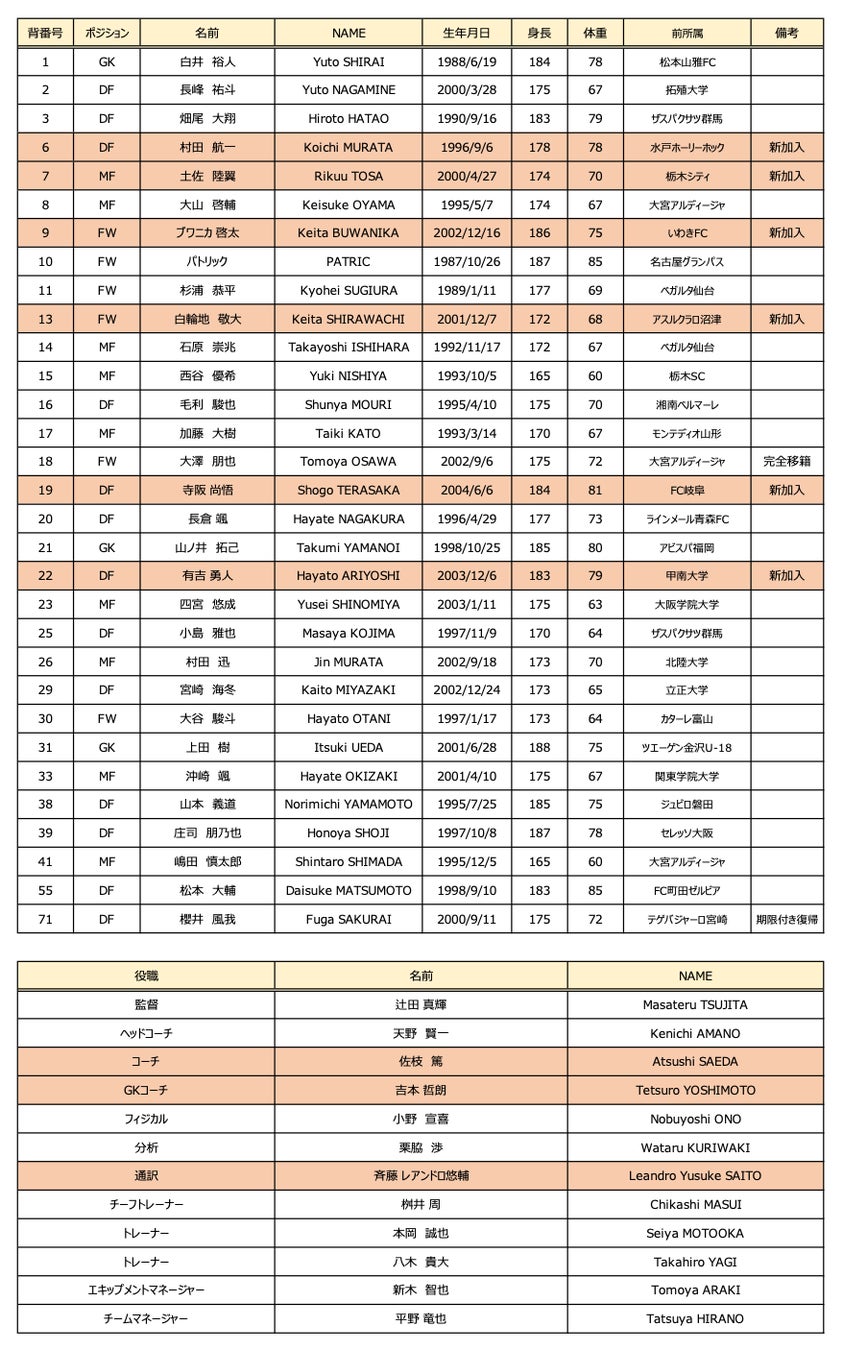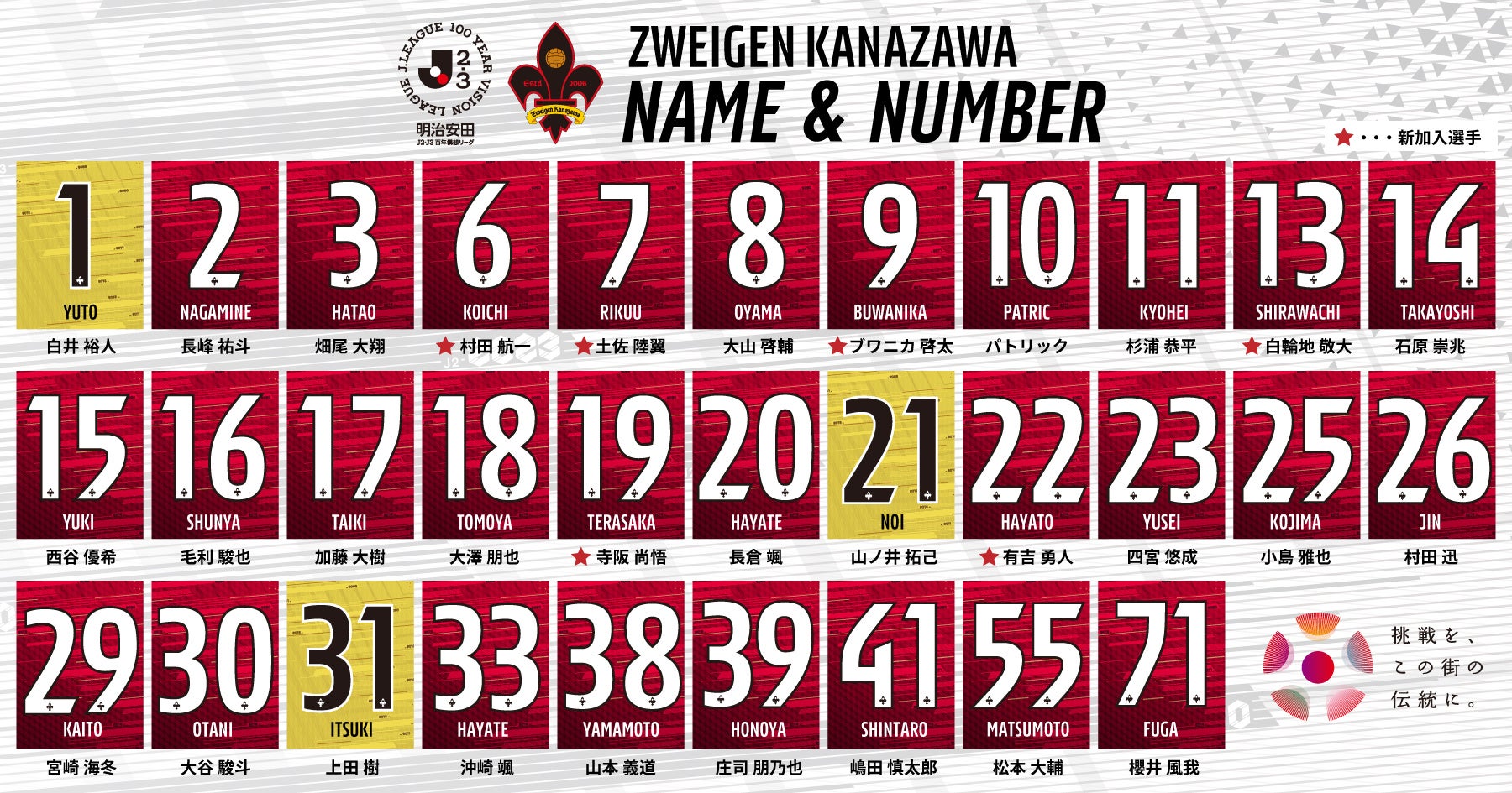 この度、ツエーゲン金沢(J3)において、明治安田J2・J3百年構想リーグを闘う監督・スタッフ・選手並びに選手背番号が決定いたしましたのでお知らせいたします。