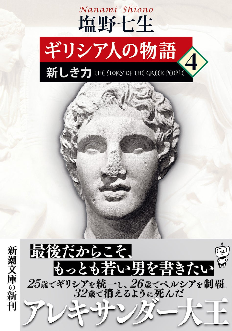 本書は単行本として刊行された『ギリシア人の物語Ⅲ 新しき力』を『3 都市国家ギリシアの終焉』(9月に既刊)と本書『4 新しき力』に分冊して文庫化したもの。古代ギリシアで勃興し、現代政治の礎ともなった民主政によって力を蓄えたアテネが巨大帝国ペルシアと対峙します。しかしその民主政とコインの裏表の関係にあるポピュリズムによってアテネで力を失うと、周縁国でマケドニアが台頭。本作はその王子として生まれ、ペルシアを制覇し、インドまで到達したアレクサンドロス大王の短くも烈しい生涯を描いた作品になっています。長編歴史エッセイとしては最後の作品であり、「最後だからもっとも若い男を書きたい」と選ばれたテーマを、執念で描き尽くした傑作歴史長編になっています。