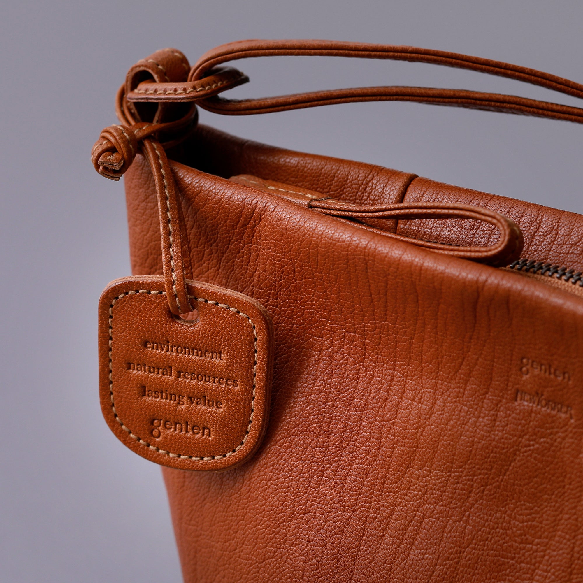 【genten】オリジナルサコッシュとのコラボレーション。ファスナーを開けた内側には「ニューヨーカータータン」を施しました。カットワークバッグ同様、オーガニックコットンを使用しています。山羊革はしなやかで柔らかく、傷になりにくいのが特徴。洗練されたデザインはユニセックスで使用でき、コンパクトでありながら、広めのマチで収納力もバッチリ。両手があくサコッシュは休日や旅行にもおすすめです。gentenのコンセプト刻印プレート・チャーム付き 。