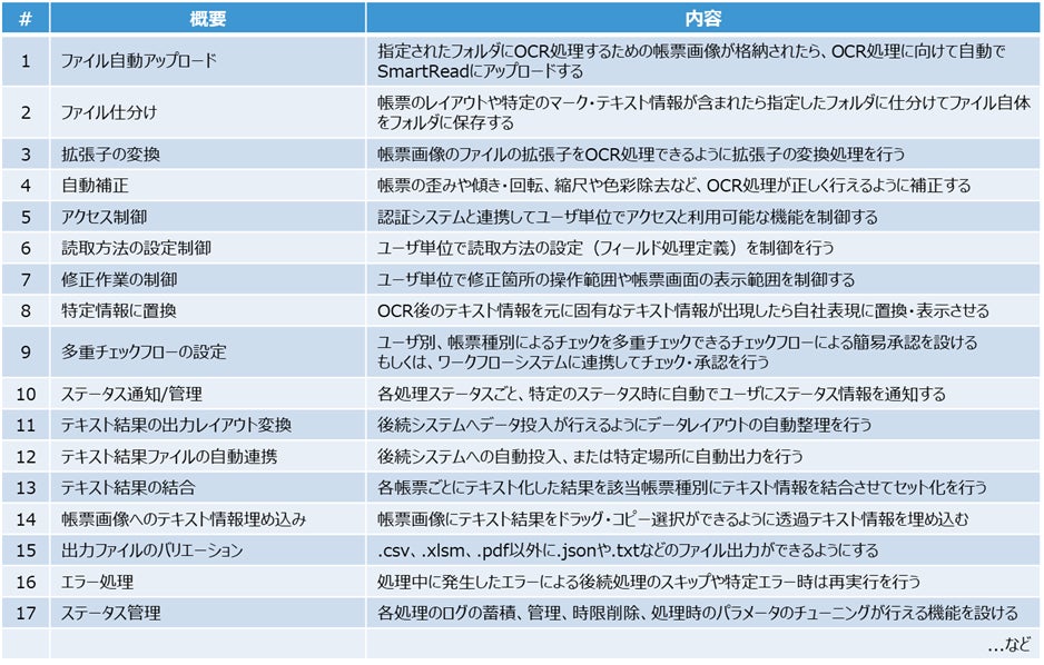 この度、提供を開始するSmartRead向け機能開発メニューは、SmartReadをより企業共通の業務フローにFITさせ、AI OCRによる業務効率化をより拡大するためのメニュー群です。AI OCRは帳票などをテキスト化することに長けていますが、テキスト化する前後の作業や業務要件まではカバーしていません。
