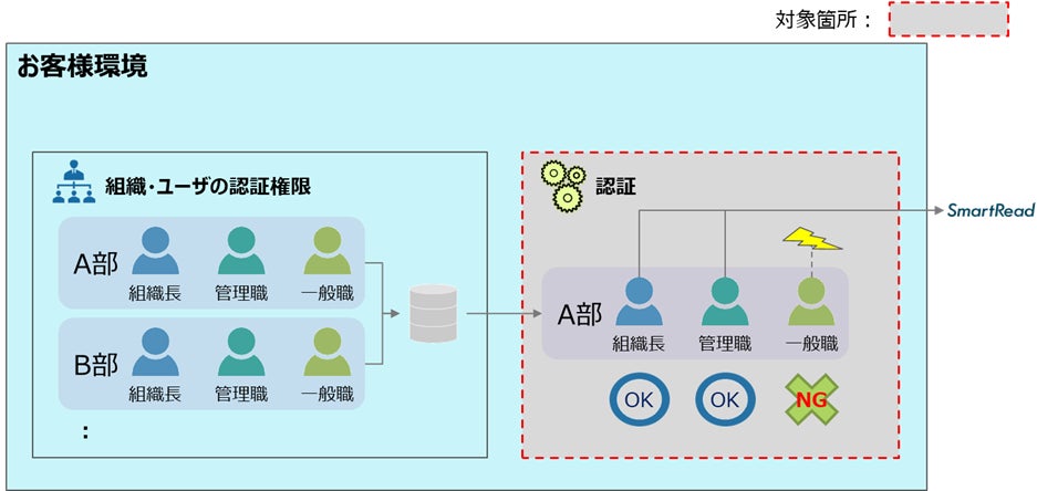 Active Directoryなどの認証システムのユーザ認証情報を元にログイン・アクセス制御を可能にする仕組みを開発します。自動的にSmartReadへの接続認証を行うことができるため、必要な人のみにデータの展開が可能になります。
