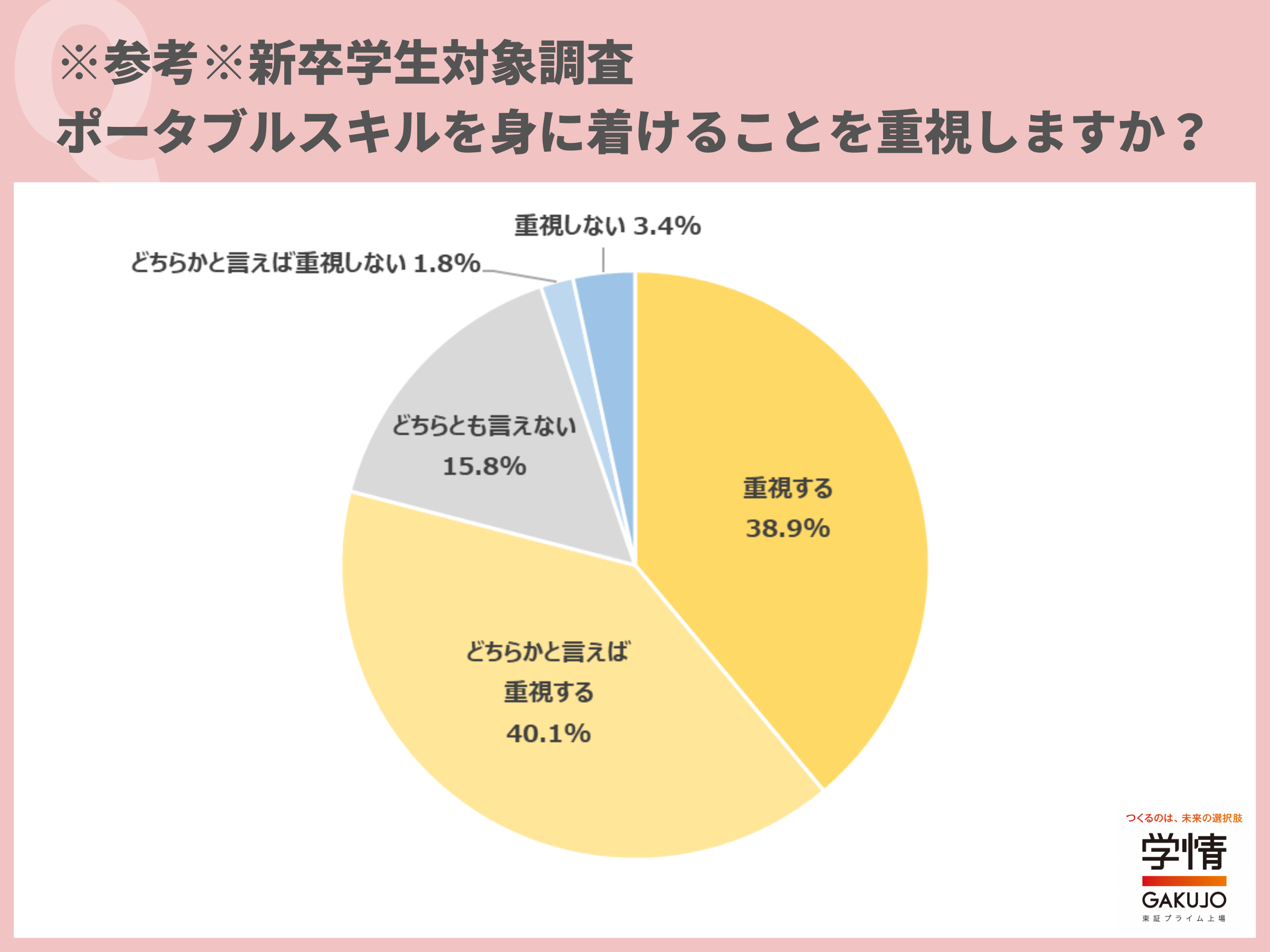 ポータブルスキルを身に着けることについて、「重視する」と回答した20代が49.0%に上りました。「どちらかと言えば重視する」40.2%を合わせると、約9割の20代が「ポータブルスキル」の習得を重視していることが分かります。ポータブルスキルの取得を重視すると回答した割合は、新卒学生よりも10.2ポイント高く、実際に仕事をしたことがあるビジネスパーソンは、ポータブルスキルの習得をより重視していることが分かります。
