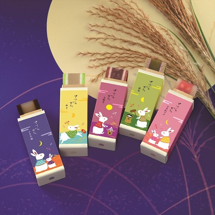 大納言・抹茶・柚子・黒糖・紅粒 とりどりの5種の味わい。月夜に跳ねる可愛らしいうさぎのパッケージ。
