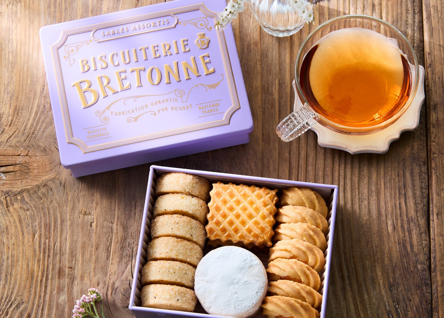 華やかなスミレ色の缶に香りや風味を引き出した4種のクッキーをとじ込めた、ティータイムにぴったりなクッキー缶。昨年ご好評いただいた、芳醇なバニラが香る「バニラ・フィアンティーヌ」や、香り高いアールグレイにオレンジのアクセントを添えた「サブレ・アールグレイ」、アプリコットのコンフィチュールをしぼった繊細な食感の「アプリコット」の3種に、発酵バターの豊かな風味が広がる奥深い味わいの「サブレ・ブルトンヌ パヴェ」を新たに加えた4種の美味しさがお楽しみいただけます。