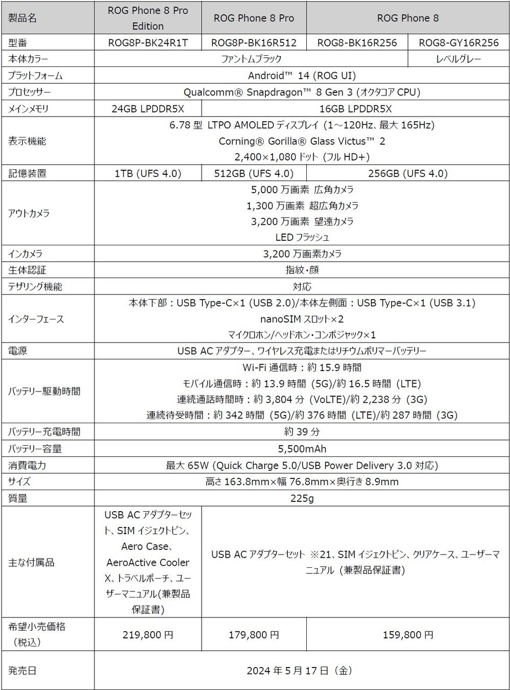●ROG Phone 8シリーズの製品仕様概要と希望小売概要と発売日および希望小売価格