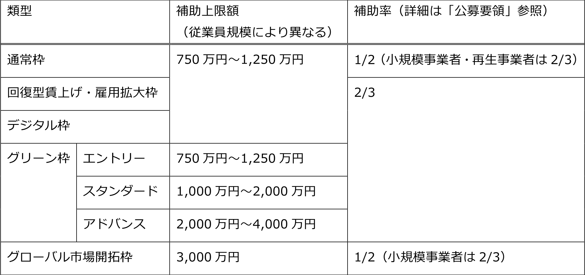 中小企業・小規模事業者等が取り組む革新的サービス開発・試作品開発・生産プロセスの改善(以下、「生産性向上」という。)に必要な設備・システム投資等を支援する「通常枠」、業況が厳しい事業者が賃上げ・雇用拡大の取組に資する生産性向上に必要な設備・システム投資等を支援する「回復型賃上げ・雇用拡大枠」、DXに資する生産性向上に必要な設備・システム投資等を支援する「デジタル枠」、温室効果ガスの排出削減に資する取組に応じた生産性向上に必要な設備・システム投資等を支援する「グリーン枠」、海外事業の拡大等を目的とした設備投資等を支援する「グローバル市場開拓枠」について、本日より公募を開始しました。