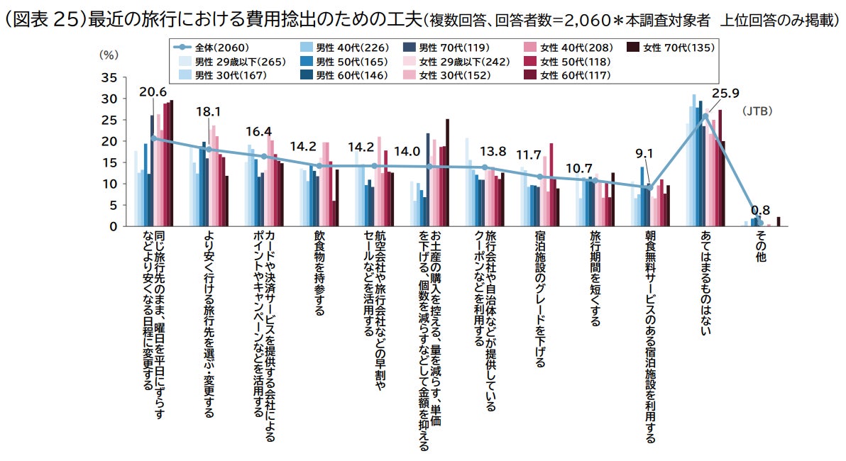 平均旅行費用(単価)は、物価高で価格自体が上昇しているものの、日数の短期化や、旅行先の変更などの旅行者の工夫(図表25)もあり、費用の抑制傾向がみられ前年並み