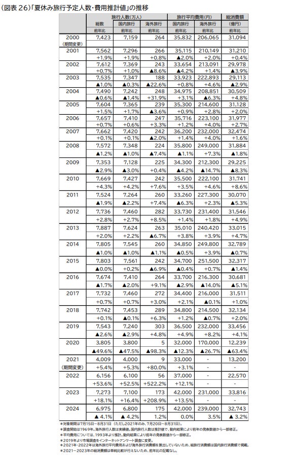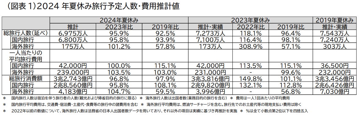 JTBは、「夏休み(2024年7月15日~8月31日)に1泊以上の旅行に出かける人」の旅行動向見通しをまとめました。本レポートは、1泊以上の日本人の旅行について、各種経済動向や消費者行動調査、運輸・観光関連データ、JTBグループが実施したアンケート調査などから推計したもので、1969年より継続的に調査を実施しています。