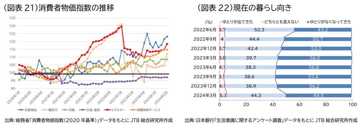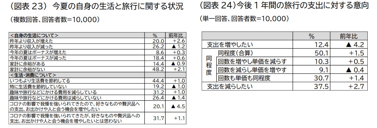 JTBが実施したアンケートで、「今夏の自身の生活と旅行に関する状況」を聞いたところ、「昨年より収入が増えた(20.0%)」は前年から増加、「昨年より収入が減った(26.2%)」は減少となっており、収入面では良化傾向がみられます。その一方で、「家計に余裕がある(14.4%)」は前年から減少、「家計に余裕はない(48.2%)」は増加となっており、前述の日本の経済情勢の影響もあってか、生活は依然として厳しい状況が続いています。この状況が消費にも影響していると考えられ、「いつもより生活費を節約している(44.4%)」、「趣味や旅行などにかける費用を減らしている(31.2%)」、「コロナの影響で我慢を強いられてきたが、好きなものや贅沢品への支出、お出かけや人と会う機会を増やしたいとは思わない(31.7%)」はいずれも前年から増加しており、「特に生活費を節約していない(19.2%)」、「趣味や旅行などにかける費用は減らしていない(26.4%)」、「コロナの影響で我慢を強いられてきたので、好きなものや贅沢品への支出、お出かけや人と会う機会を増やしたい(20.1%)」はいずれも減少しています(図表23)。