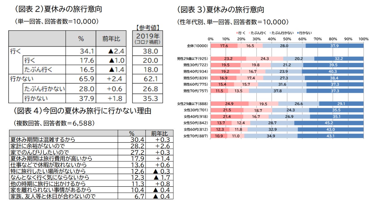 2024年夏休み(7月15日~8月31日出発)の帰省を含めた旅行の詳細について、前述のアンケートで聞きました。今年の夏休みの旅行意向については、「行く(“行く”と“たぶん行く”の合計)」と回答した人は調査時点で34.1%と前年から2.4ポイント減少しました(図表2)。意向は新型コロナウイルス感染症(以下、新型コロナ)禍の21年が19.8%となって以降、22年は36.1%、23年は36.5%と年々増加し、コロナ禍前の2019年(38.0%)に迫る回復傾向をみせていましたが、今年は減少する結果となりました。