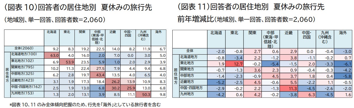 居住地別に旅行先を見ると、旅行先と居住地が同じ地方である域内旅行の割合は、「北海道(63.0%)」、「東北(53.9%)」、「九州(50.3%)」の3地域で50%を超えています。一方、関東地方の居住者では旅行先が「関東」となっているのが22.4%であるのに対し「中部」は27.5%、中国・四国地方の居住者では旅行先が「中国・四国」となっているのが25.9%であるのに対し「近畿」は30.2%であり、隣接する地方に分散している様子がうかがえます (図表10)。前年と比較すると、北海道、中国・四国、九州では域内旅行の割合は減少していますが、東北、関東、中部、近畿では増加しており、地域によって異なる特徴がみられます(図表11)。