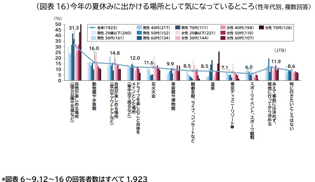 出かける場所として気になっているところは、「自然が楽しめる場所(国立公園や花畑など)(31.3%)」、次いで「動物園や水族館(16.0%)」となりました。(図表16)。